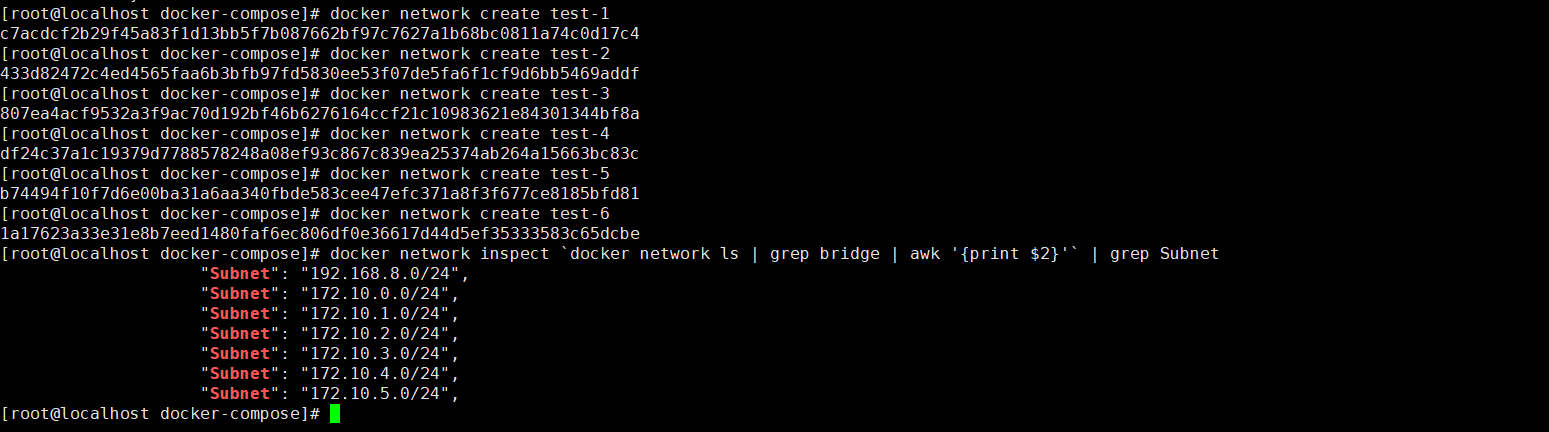 bashdocker network create test-1 docker network create test-2 docker network create test-3 docker network create test-4 docker network create test-5 docker network create test-6 docker network inspect `docker network ls | grep bridge | awk '{print $2}'` | grep Subnet # 输出示例: "Subnet": "192.168.8.0/24" "Subnet": "172.10.0.0/24" "Subnet": "172.10.1.0/24" "Subnet": "172.10.2.0/24" "Subnet": "172.10.3.0/24" "Subnet": "172.10.4.0/24" "Subnet": "172.10.5.0/24"