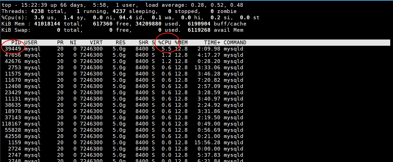一、使用top命令找出mysl进程中占用CPU靠前的线程