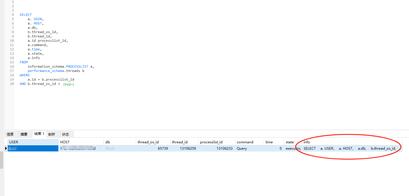 使用以下SQL语句可以查询到具体的线程信息,包括其操作系统线程ID(thread_os_id)和正在执行的SQL语句:
