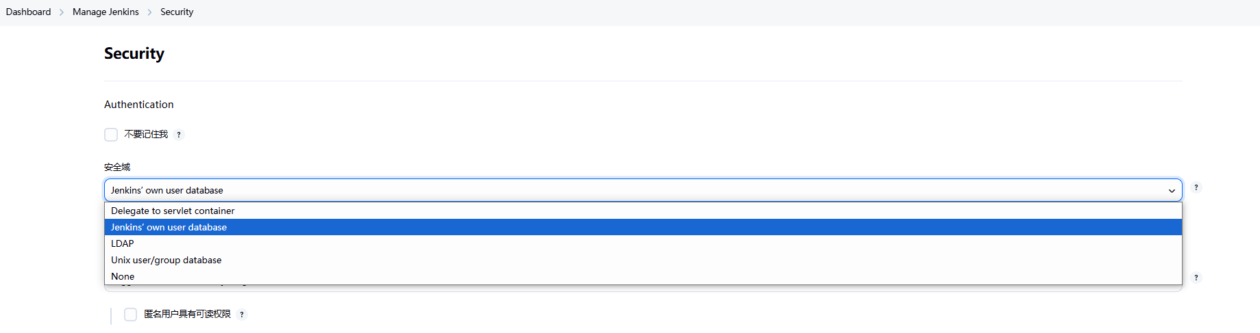 安全域👍Jenkins数据库:使用Jenkins内置用户数据库LDAP:集成企业LDAP目录服务(需要安装插件后才能使用)