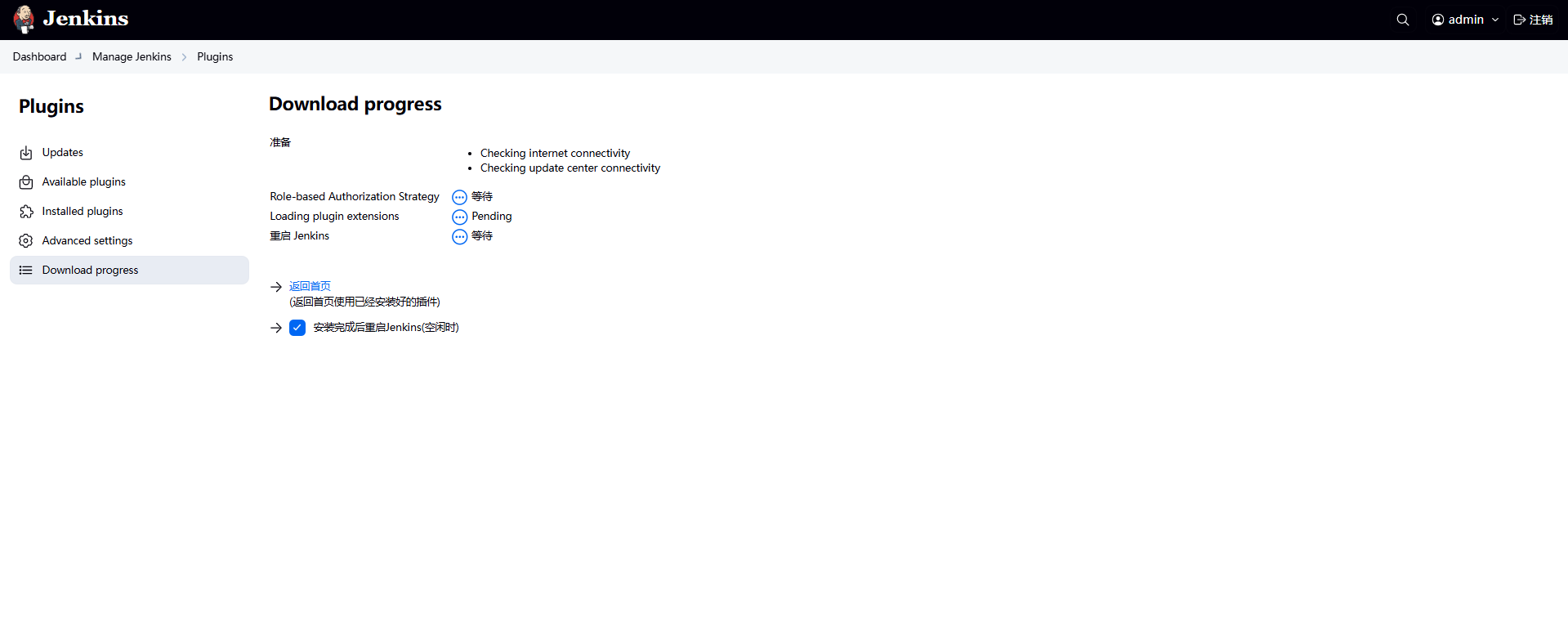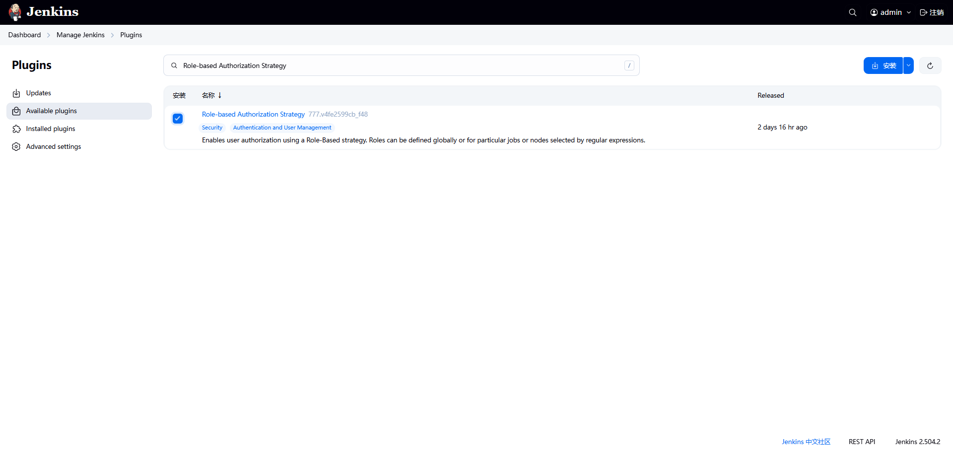 系统管理 → 管理插件 → 可用插件 → 输入Role-based Authorization Strategy