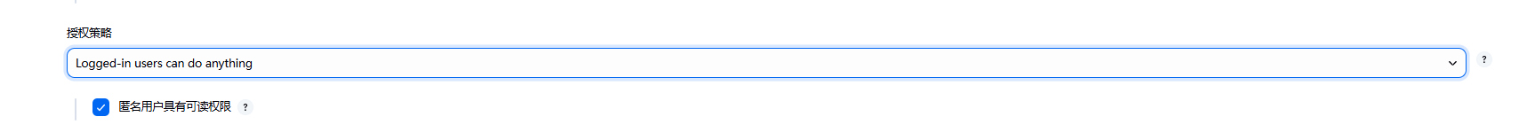 授权策略默认是登录用户可以做任何事情;后面有说到基于RBAC的授权策略,这里先不介绍。具体的可以参考,Jenkins 插件章节的Role-Based Strategy插件介绍4、