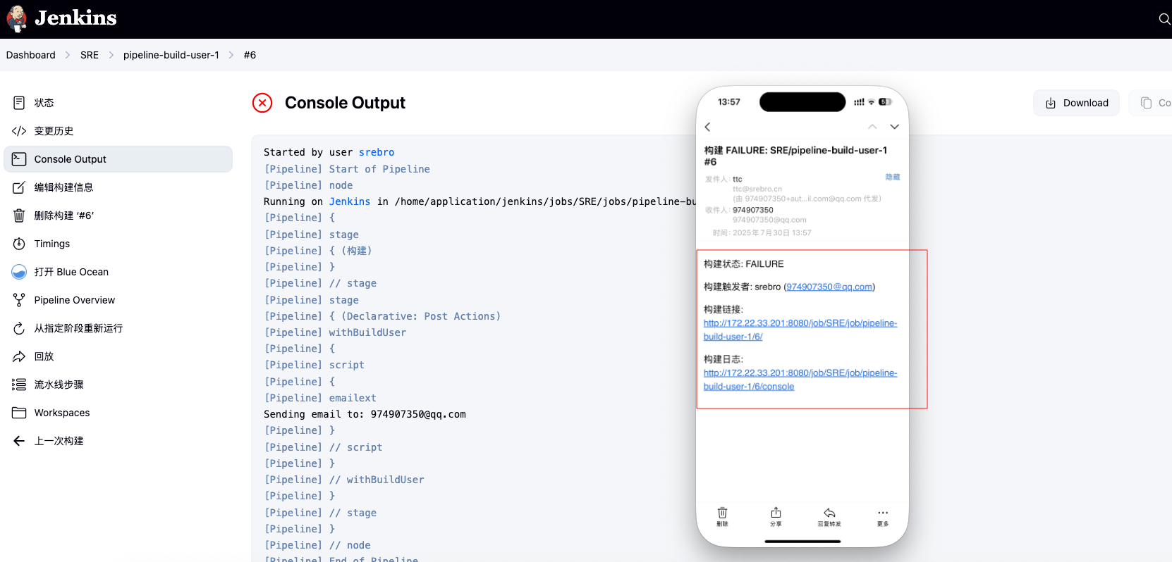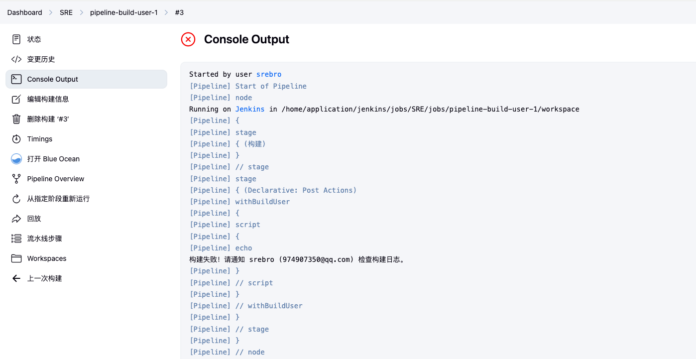 echo "构建失败!请通知 ${env.BUILD_USER} (${env.BUILD_USER_EMAIL}) 检查构建日志。"