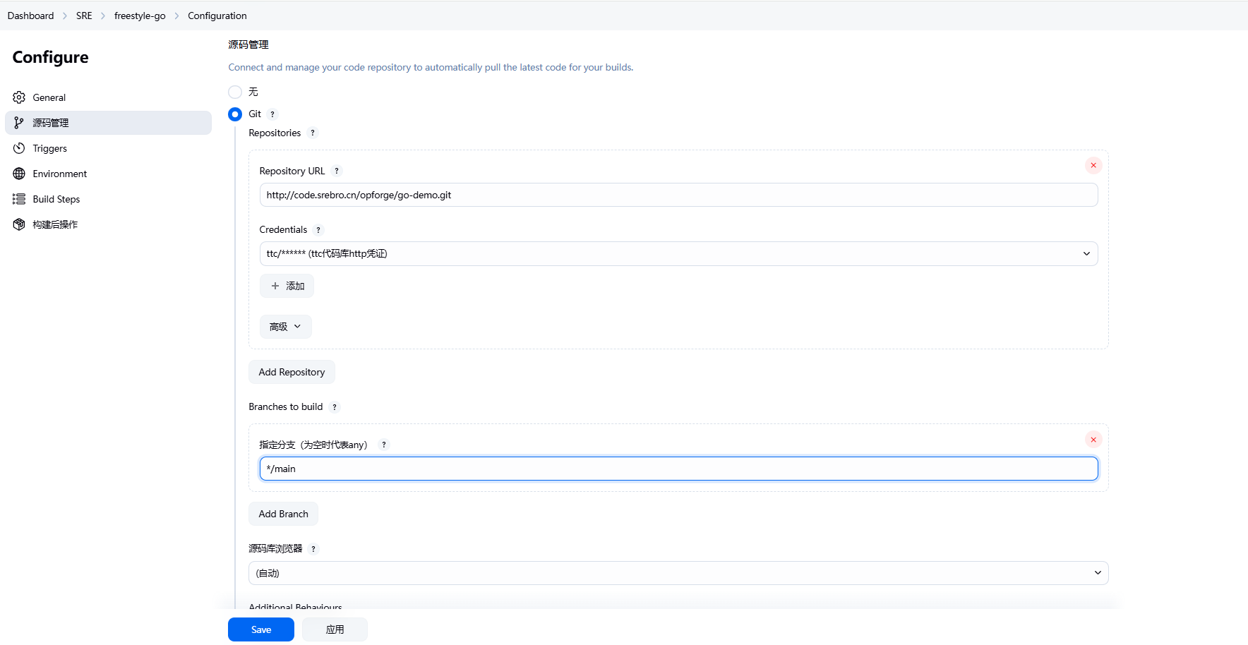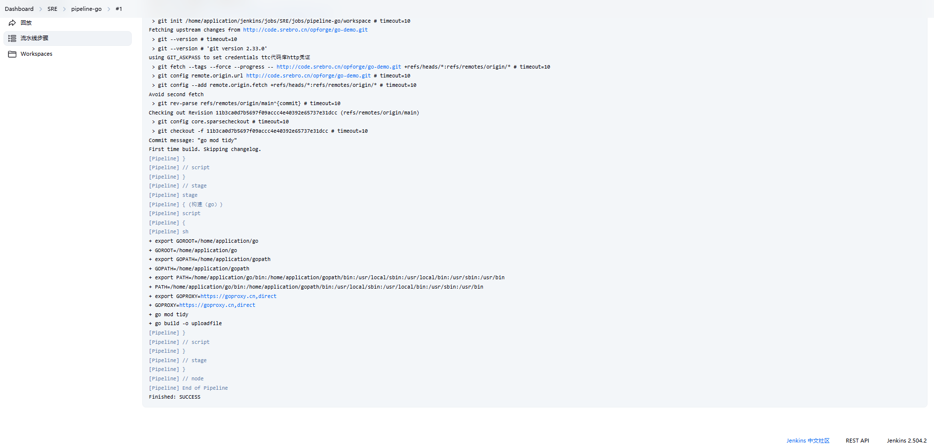 checkout scmGit(branches: [[name: '*/main']], extensions: [], userRemoteConfigs: [[credentialsId: 'a11aa99b-7bba-48fd-bd01-46b68732578a', url: 'http://code.srebro.cn/opforge/go-demo.git']])