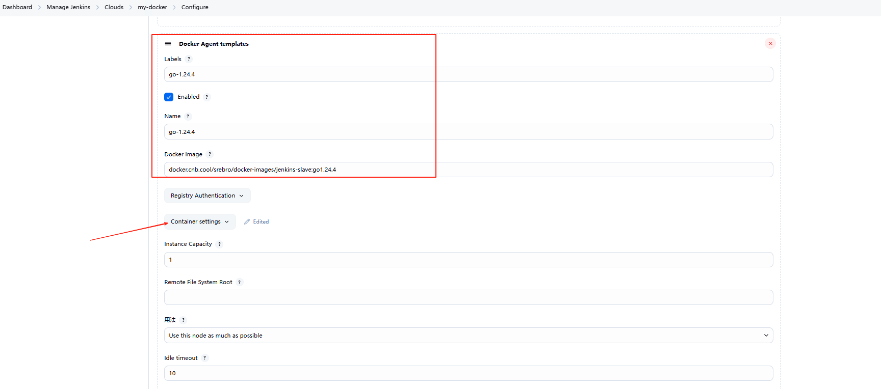 已有的cloud云节点 > configure > Docker Agent templates > 进度条拖到最下面 > Add Docker Template