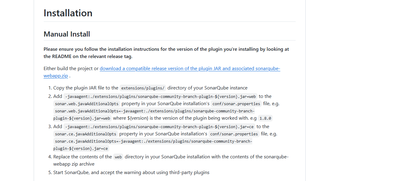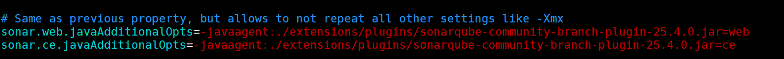 sonar.web.javaAdditionalOpts=-javaagent:./extensions/plugins/sonarqube-community-branch-plugin-${version}.jar=web