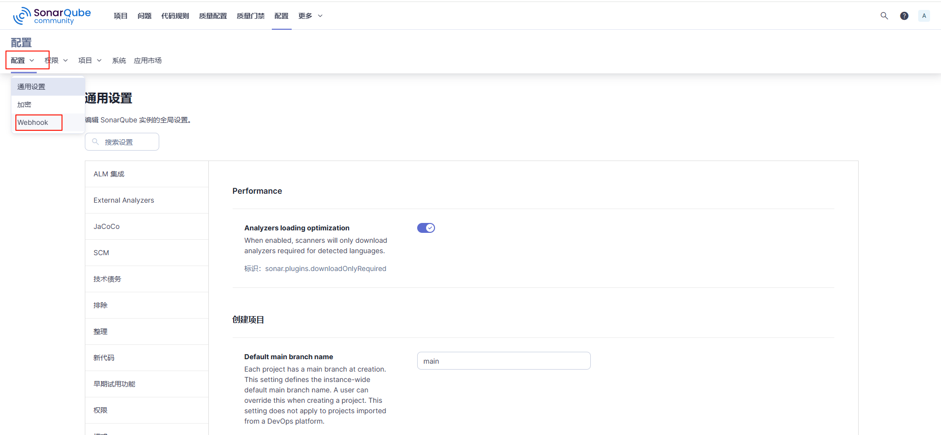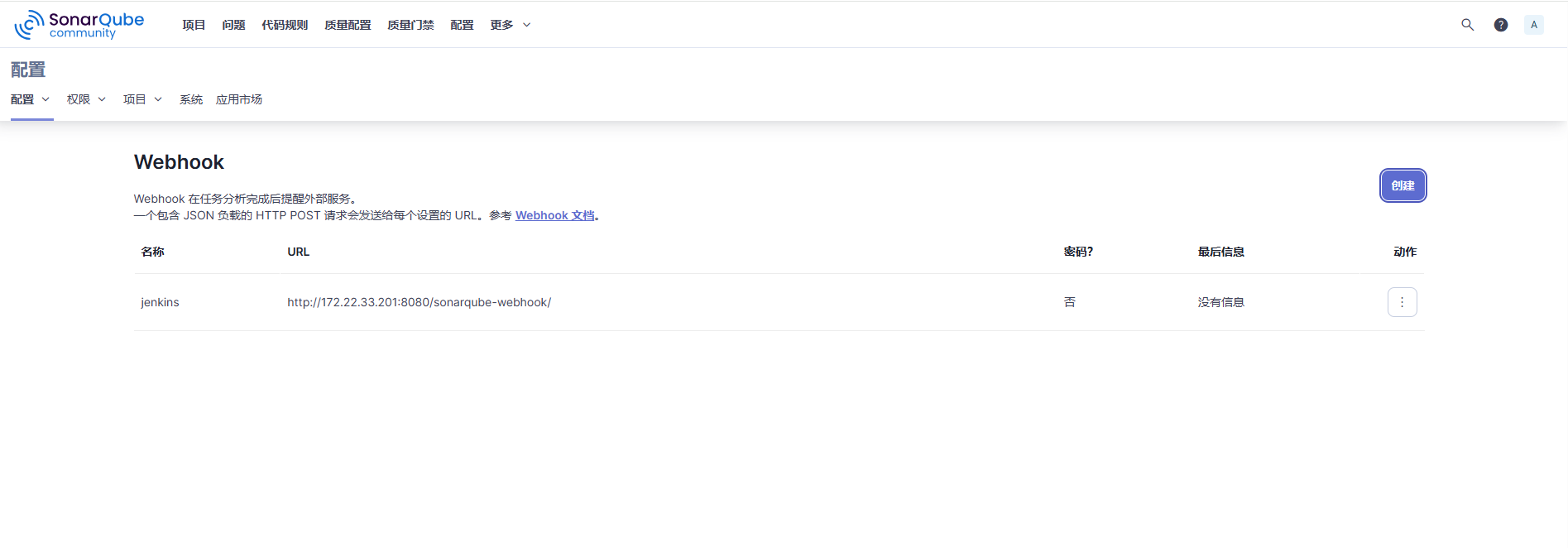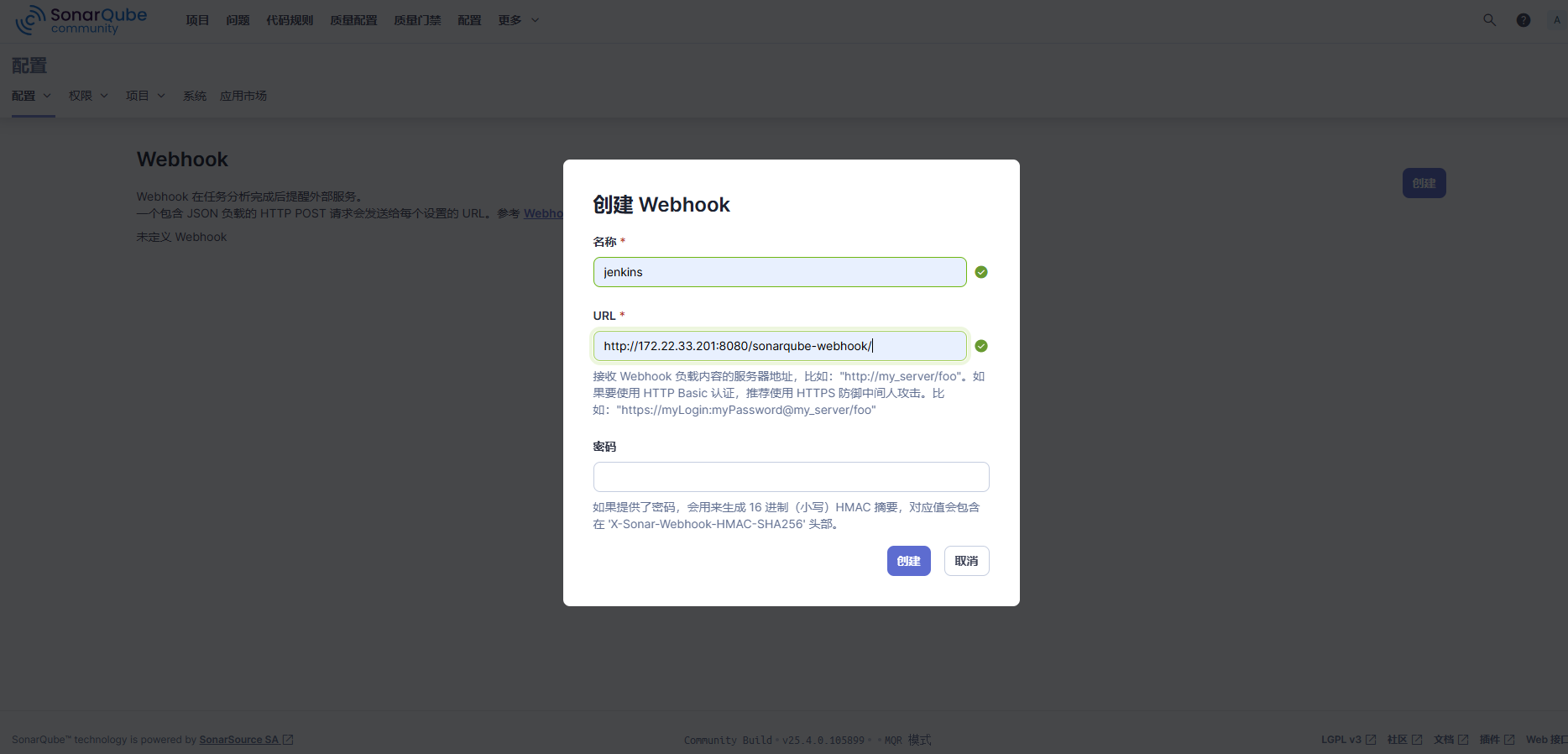 需要在sonarqube的web页面配置webhook ,名称自定义,url规则如下:其中sonarqube-webhook是固定的, 无需密码