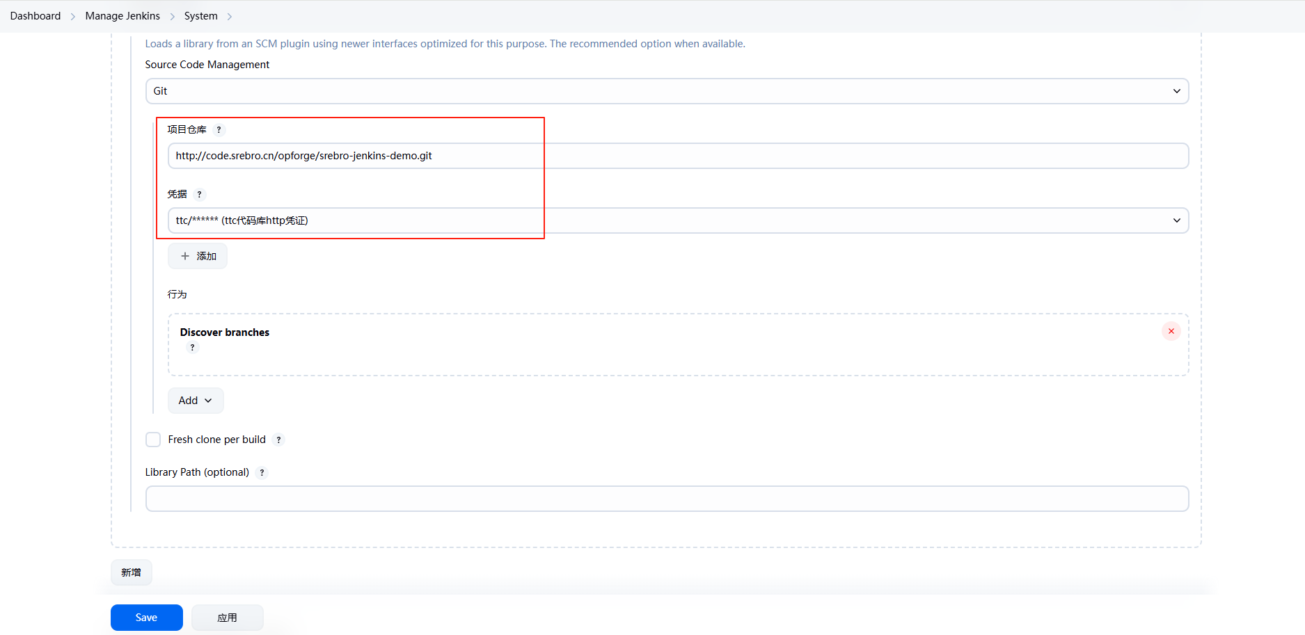 - Name:库的名称(注意这个名称后续在Jenkinsfile中引用)