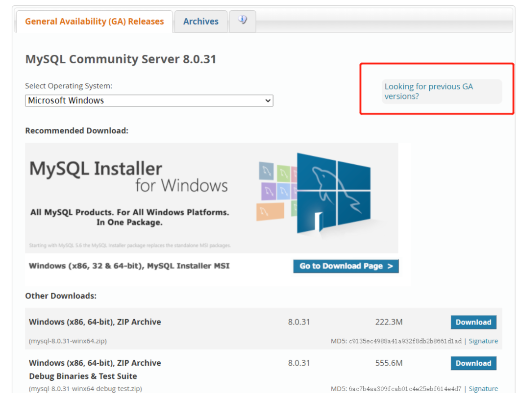 源码包 版本:过于复杂,一般有自定义需求才采用此方式 https://dev.mysql.com/downloads/mysql/ 点击“Looking for previous GA versions?”,跳转后依次选择“Source Code”“All Operating Systems(Generic)”