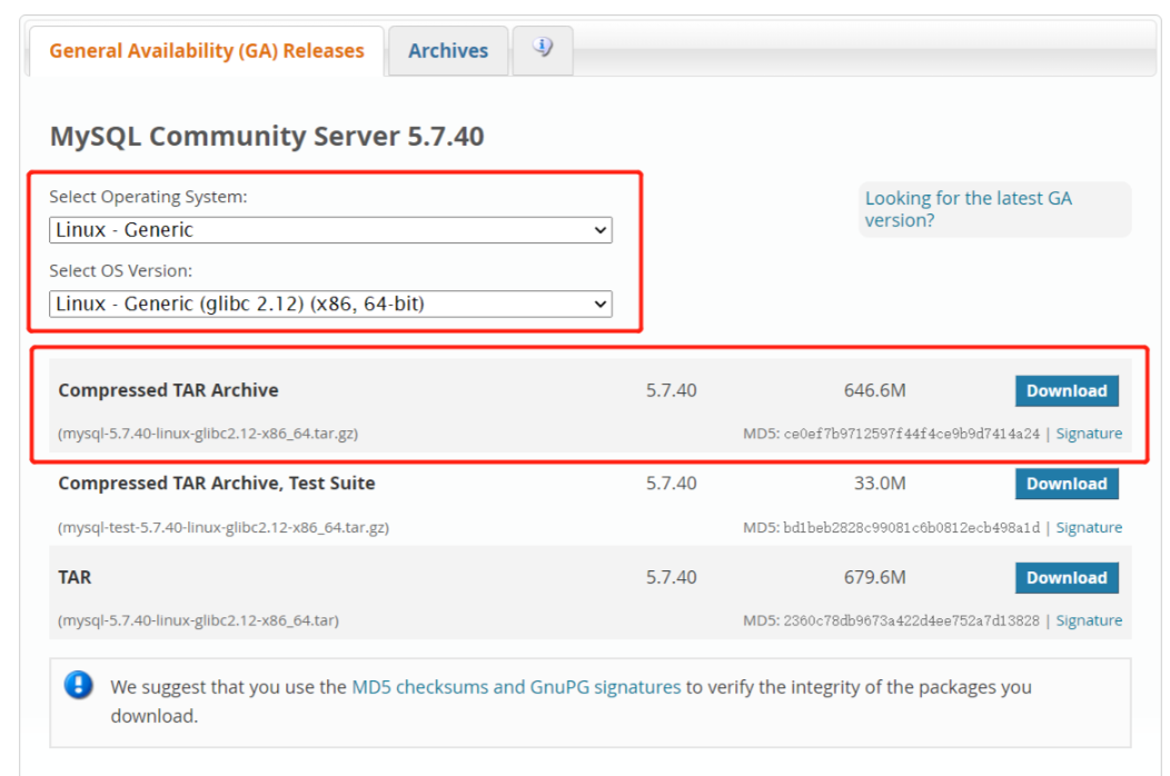 点击“Looking for previous GA versions?”,跳转后依次选择“Linux-Generic”“Linux-Generic(glibc2.12)(x86,64-bit)”