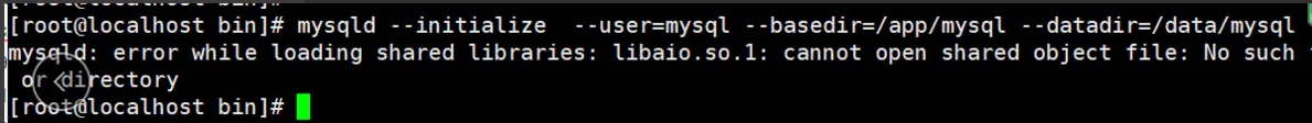 mysqld --initialize-user=mysql --basedir=/app/mysqlmyseld: error while loading shared libraries: libaio.so.1: cannot open shared obiect file: No suchor directory